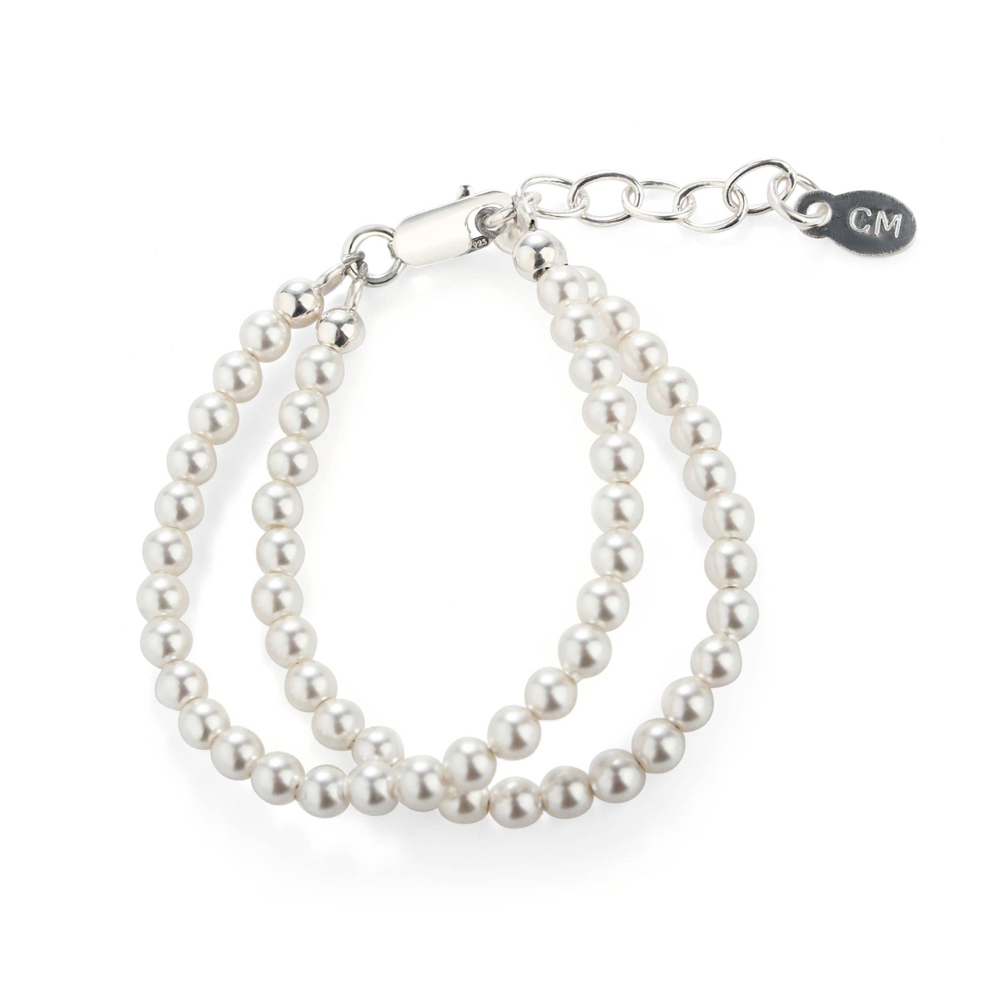 Special keepsake bracelet adorned with sterling silver and a double-strand of beautiful soft high-end Austrian simulated pearls.  Each bracelet has an extension chain, so as the child grows you just move to the next link for a perfect fit.  This bracelet is available in three sizes and is great for infants, babies, toddlers, and kids. This jewelry comes in a beautiful gift box and is hand made in the USA!  Celebrate these cherished moments with this keepsake she will treasure forever.