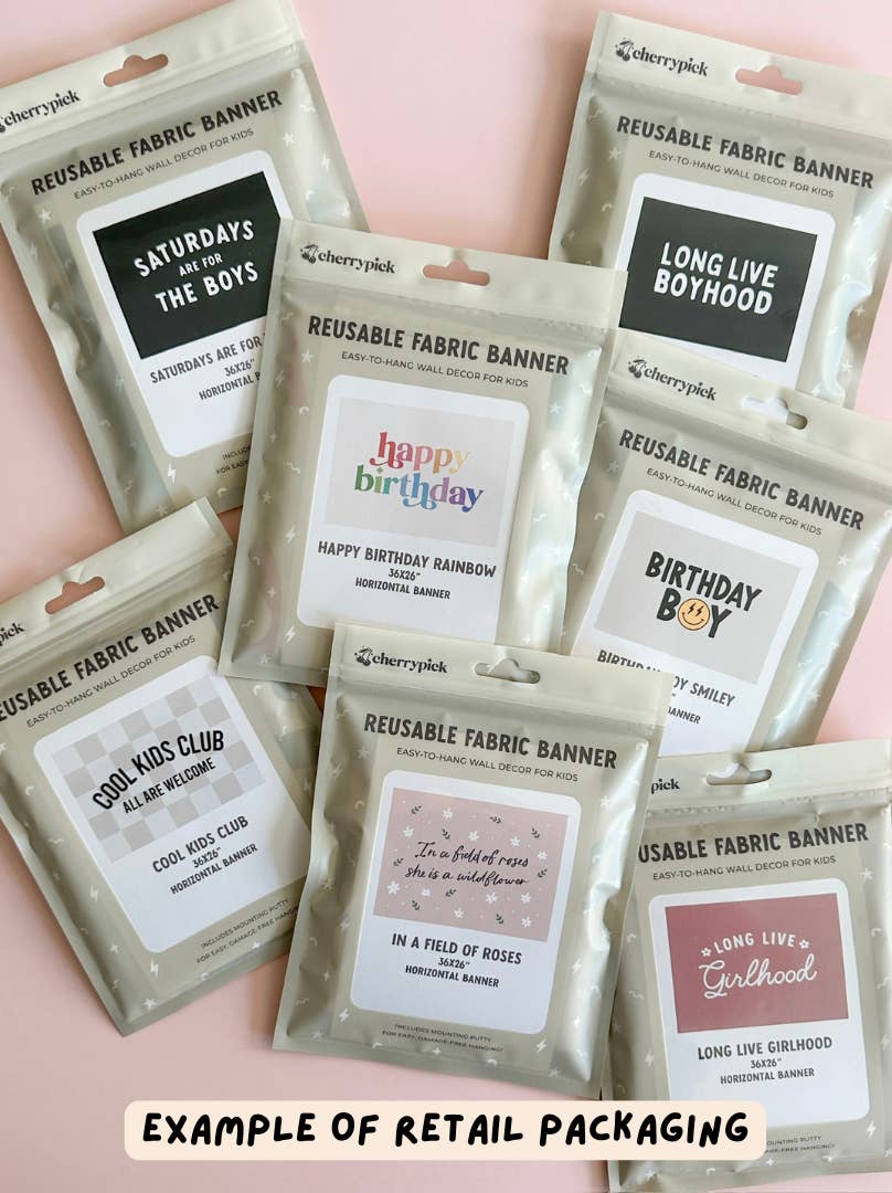 Long Live Boyhood Banner Cherrypick fabric banners are an easy and playful way to decorate with minimal effort! Whether decorating for a special occasion or simply just for fun, these banners add a unique and magical touch. Customers love these banners because they are: * Professionally printed in small batches with non-toxic ink on durable and lightweight polyester fabric * Water and mildew resistant * Machine-washable and easy to clean * Easy to hang and re-use over and over * Perfect for playroom, nursery, and kids wall decor! RETAIL-READY: Cherrypick’s signature fabric banners ship in retail-ready packaging including a hanger hole for easy merchandising! Each banner includes mounting putty for easy, damage-free hanging!