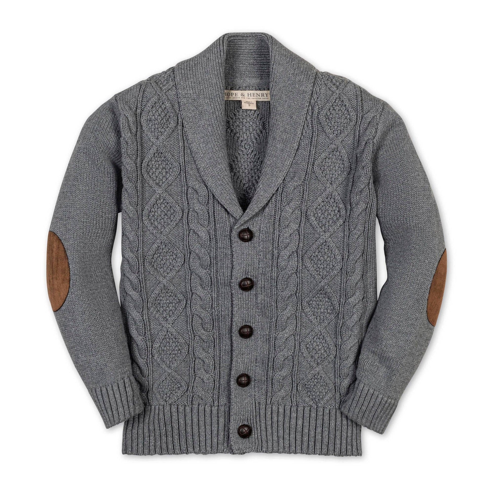 He'll be the best dressed in this standout piece. This plush sweater cardigan is crafted from soft organic cotton and has beautiful cable knit details. Features a cozy shawl collar, faux suede elbow patches, and a faux leather button front closure. Layers nicely over a collection of organic cotton polos and button downs for a handsome look. * 100% Organic Cotton, exclusive of trims. Garment is 100% GOTS-Certified Organic. Learn more about our certifications here. * Faux leather buttons. Faux suede elbow patches. * Shawl collar and front patch pockets. Machine washable.