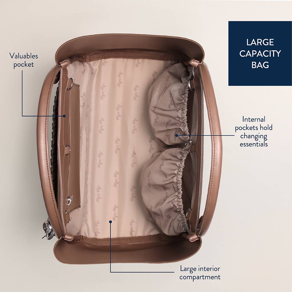 Meet the tote you`ll never outgrow - from diaper bag for baby to chic purse for brunch! The Boss Tote is designed to move with you featuring an easy-wipe vegan leather exterior and the option to carry by handles or luxe, chain-detailed shoulder straps. Organization is a total breeze with a spacious main compartment offering multiple interior pockets for your valuables, changing essentials & so much more! Plus, a front pocket for easy access & hook closure to keep everything inside secure. Bonus: includes a coordinating changing pad, stroller straps, and removable tassel! Safe to say, you`re going to tote-ally love it!